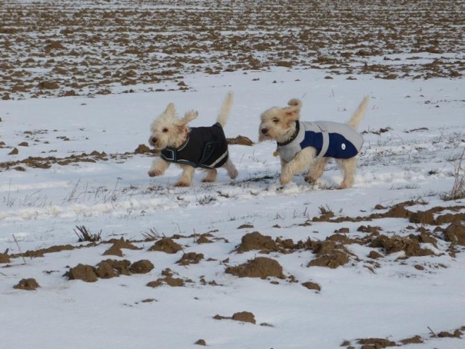 Auch Winterwürfe dürfen bei schönem Wetter aus dem Haus und draußen in den Stallungen spielen.